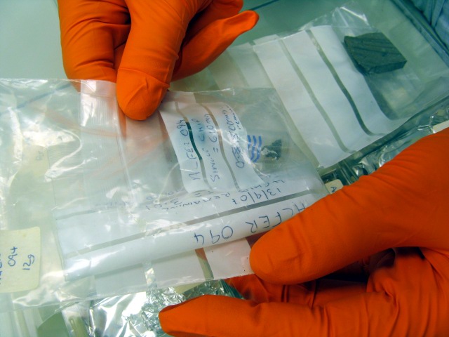 Interestingly all samples from Earth plot along a single straight line on this graph (the "Terrestrial Fractionation Line" or TFL), the minerals in CAI's (the irregular light coloured inclusions common in Allende and other CV3 meteorites) also plot in a straight line but completely separate to the TFL. Before isotopic analysis can be done any terrestrial oxygen must be removed from the sample, usually this oxygen will have bonded with iron in the meteorite. To remove iron oxides the sample is reacted with ethanolamine thioglycollate which selectively reacts with iron compounds, leaving the extraterrestrial oxygen present in the silicates untouched. This compound was originally developed for hair-perming, before its original scientific use for preserving (pyritized) fossils was developed by Cornish and Doyle of the NHM, London. You can read Cornish and Doyle's papers on the subject in The Geological Curator (Volume 3, Number 8, 1983) here and Palaeontology (Volume 27, Part 2, 1984) here. Following the oxygen isotope lab, Dr Jon Watson was able to provide insight in to the work done in the organic chemistry laboratory analysing the organic compounds present in meteorites.