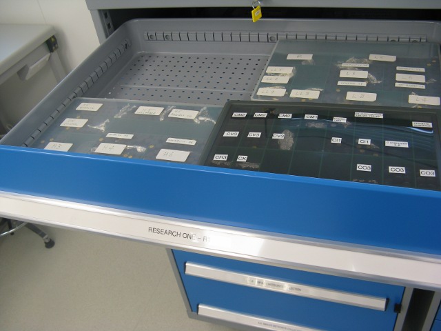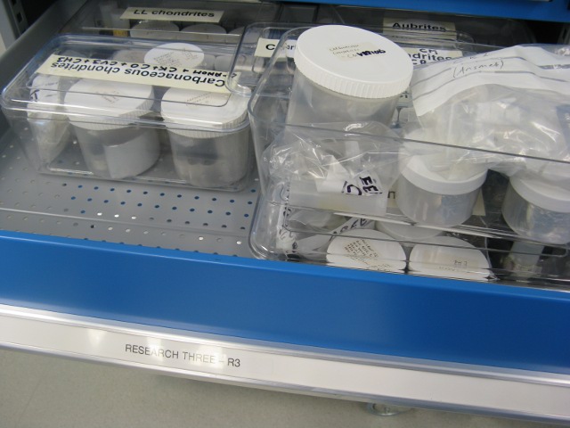 Finally, we had an opportunity to view the meteorite collection. The collection consists of several thousand specimens. It is a research collection, which means that the majority of specimens are small. As an example, for oxygen isotope work they would normally request a specimen in the region of 100mg. The collection is housed in a clean room, kept at positive pressure. The smaller samples were boxed and housed in well organised larger drawers (see images above). They have a notable collection of desert finds and were also involved in the Euromet Antarctic search for meteorites, there were several drawers containing specimens from Frontier Mountains. Most of the Antarctic specimens are actually quite small, as two examples pictured below demonstrate. We also saw some samples of Acfer 094 (C2-ung, also pictured below), this is considered one of the most primitive of all meteorites and is rich in presolar grains. Much of the 82g found has already been used by researchers around the world.