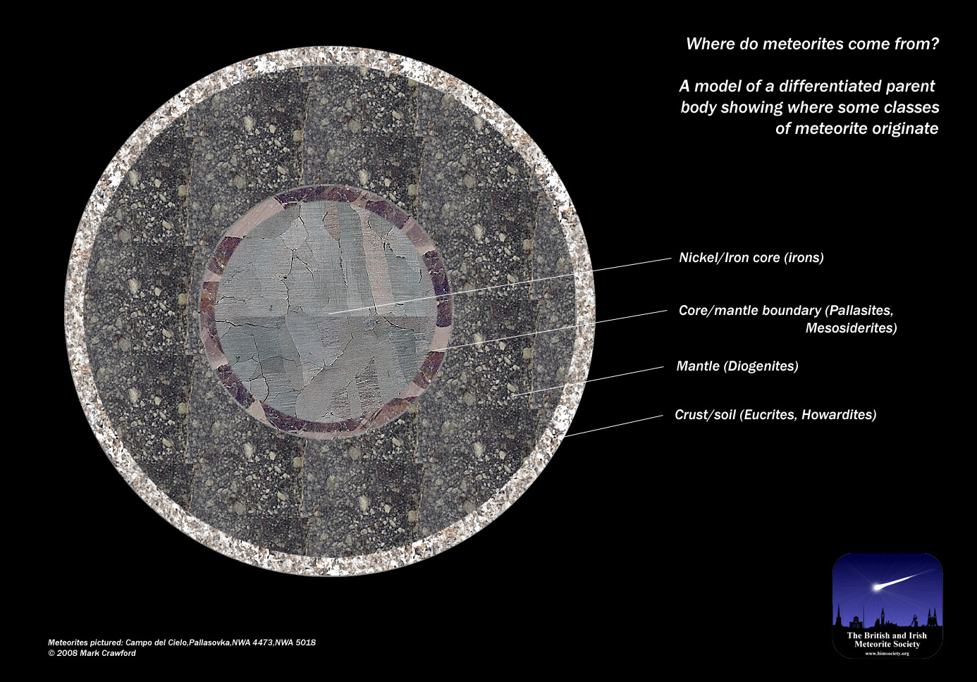 If the asteroid becomes large enough it is heated by the decay of radioactive isotopes. This can cause the various minerals and metal to melt, destroying the chondrules, and the asteroid becomes differentiated. This means that the metal sinks to the centre (due to its high density) forming a core, with other mixtures of minerals forming layers around it. Click the image on the right for BIMS member Mark Crawford's excellent illustration of a differentiated parent body.